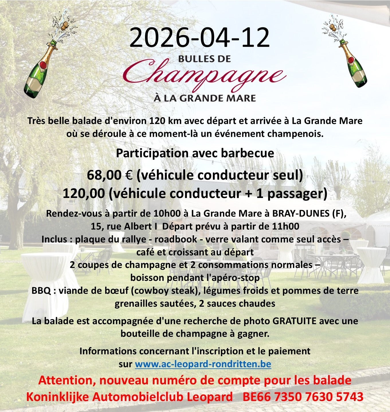 Inscription et paiement avant le 8 Avril 2026 au BE66 7350 7630 5743 au nom de Koninklijke Automobielclub Leopard vzw